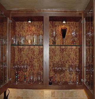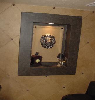 Black leather wrapped art niche with leather squares and clavos nail heads at corners .And faux finished wallpaper breakfast room. |