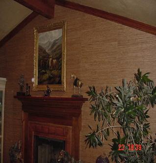 Grasscloth on fireplace wall, and green squares on a faux finish background in masterbath. |
