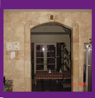 Weathered stone wrapped arch, with faux finish papered walls, and green fabric backed vinyl in guest bath |